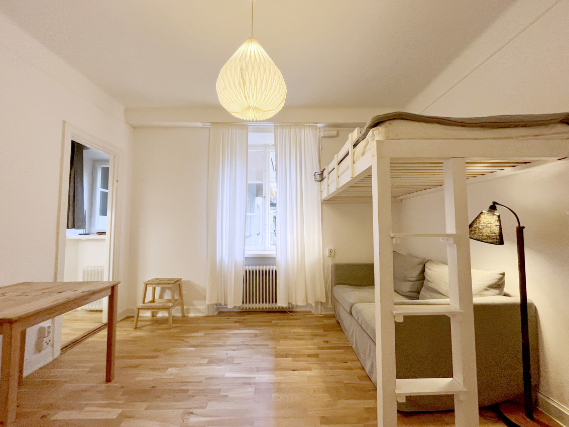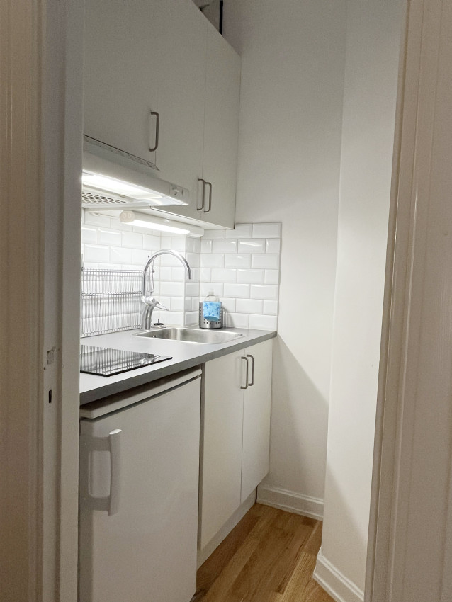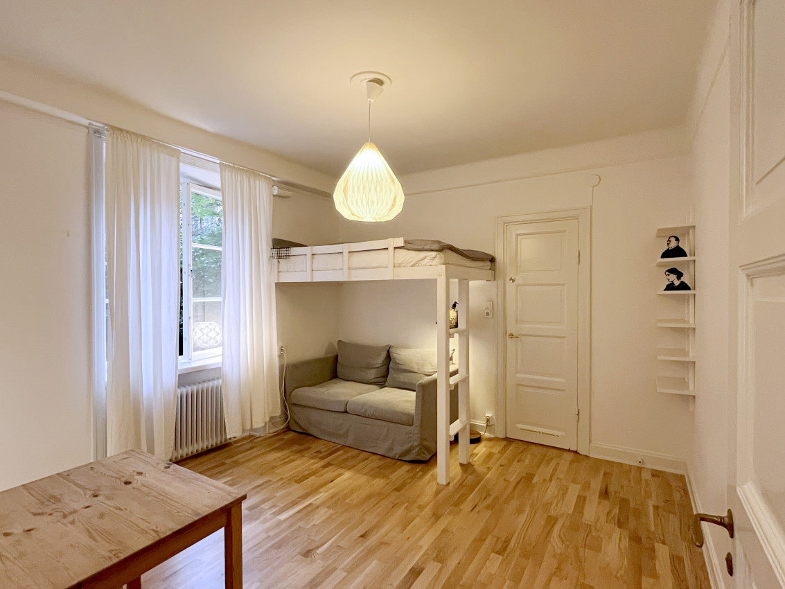 Den lilla ytan till trots är lägenheten ljus och luftig med sina 2.68 meter i takhöjd och två spröjsade fönster. Utsikt mot en tyst och lummig innergård med minimal insyn.